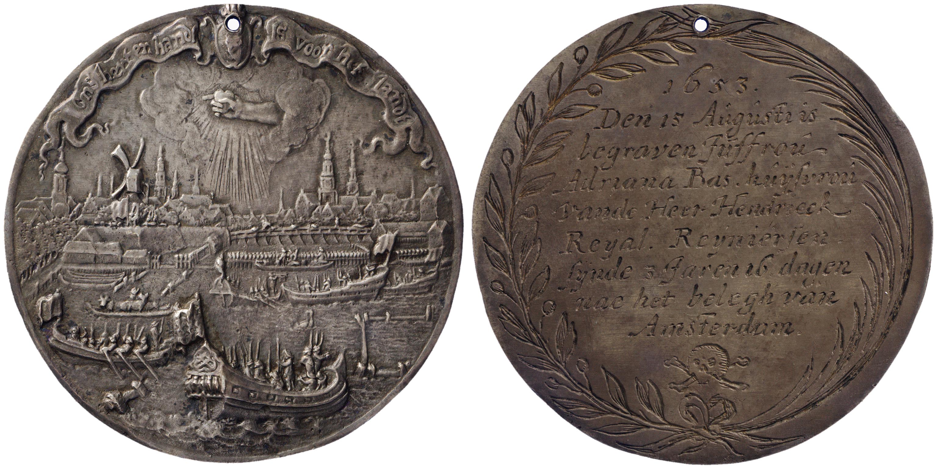 Op deze plaquettepenning met op de voorzijde het beleg van Amsterdam wordt in de tekst die op de keerzijde van de penning is gegraveerd, verwezen naar de begrafenis van Adriana Bas (1623-1653), echtgenote van Hendrick Reael (1621-1672), op 15 augustus 1653, ‘synde 3 jaren en 16 dagen’ na het beleg van Amsterdam. Adriana overleed drie maanden na de geboorte van haar dochter Maria.