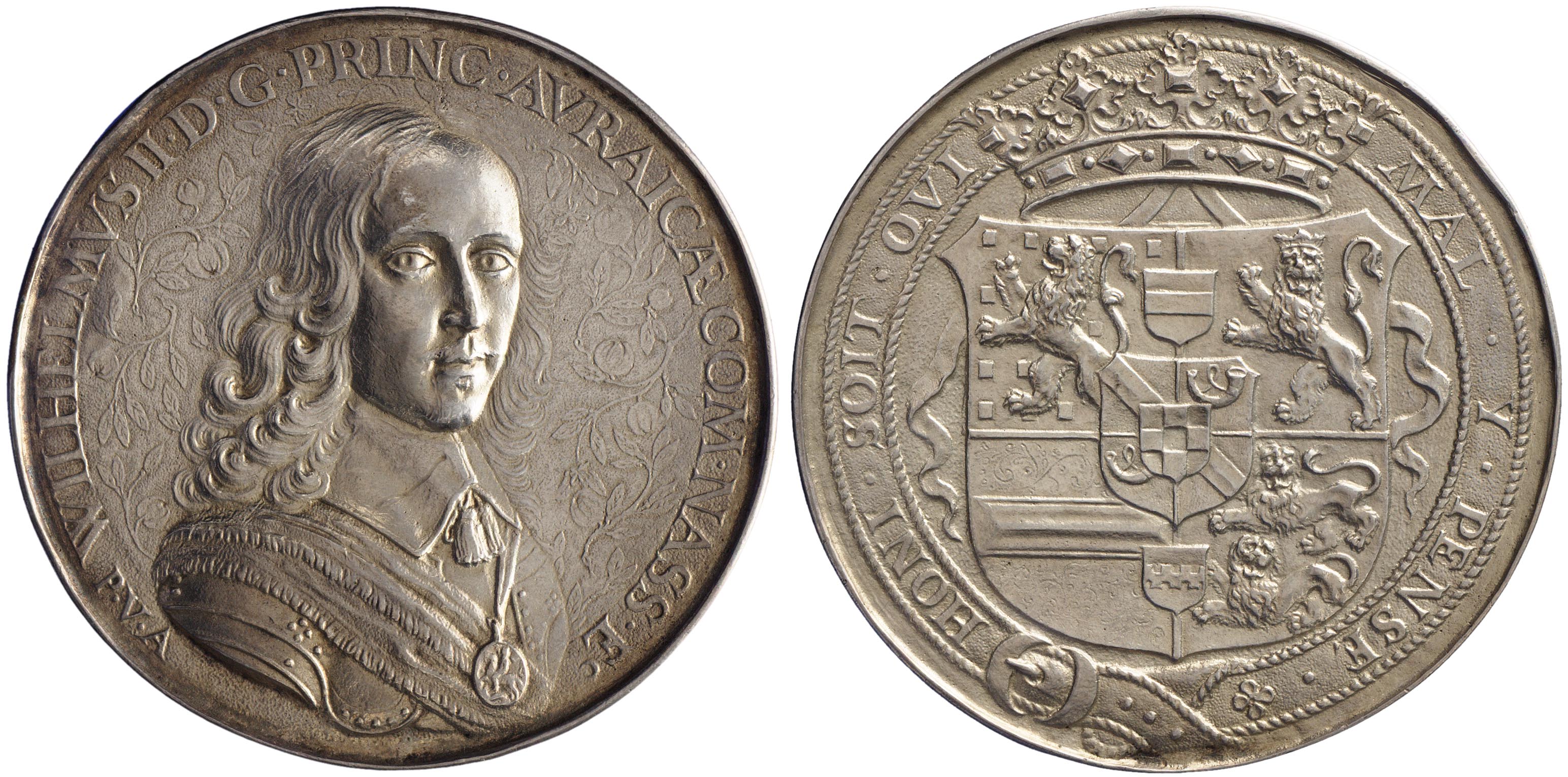 omschrift voorzijde: WILHELMVS II.DG PRINC.AVRAICAE COM. NASS.E