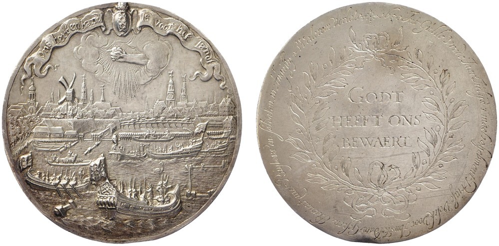 voorzijde: gezicht op Amsterdam vanaf de Amstel. Schepen met bewapende bemanning. Uit de wolken een arm, met een hart in de hand. Daarboven het wapen van Amsterdam in een banderol waarop een inscriptie.