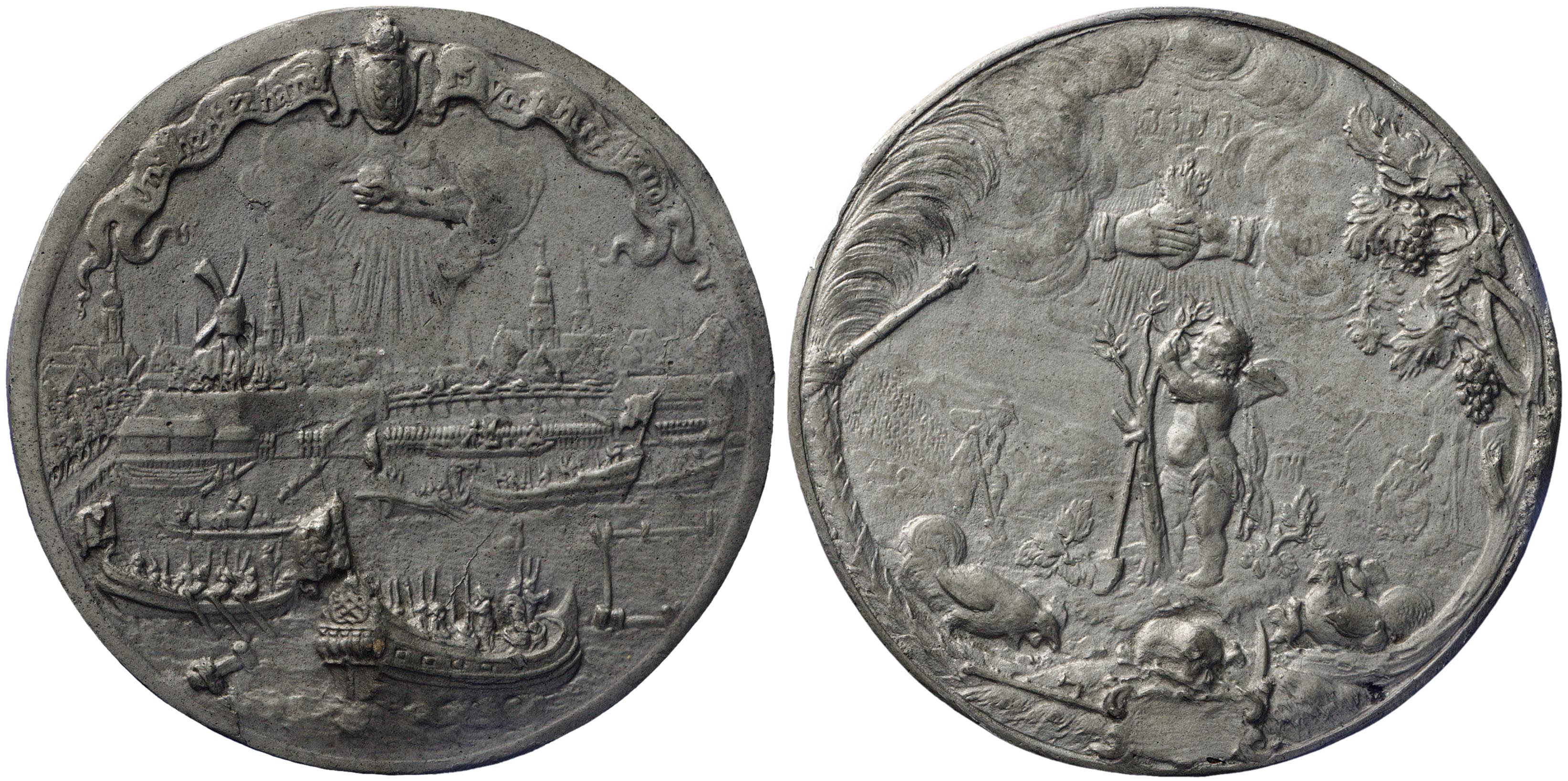 voorzijde: gezicht op Amsterdam vanaf de Amstel. Schepen met bewapende bemanning. Uit de wolken een arm, met een hart in de hand. Daarboven het wapen van Amsterdam in een banderol waarop een inscriptie.