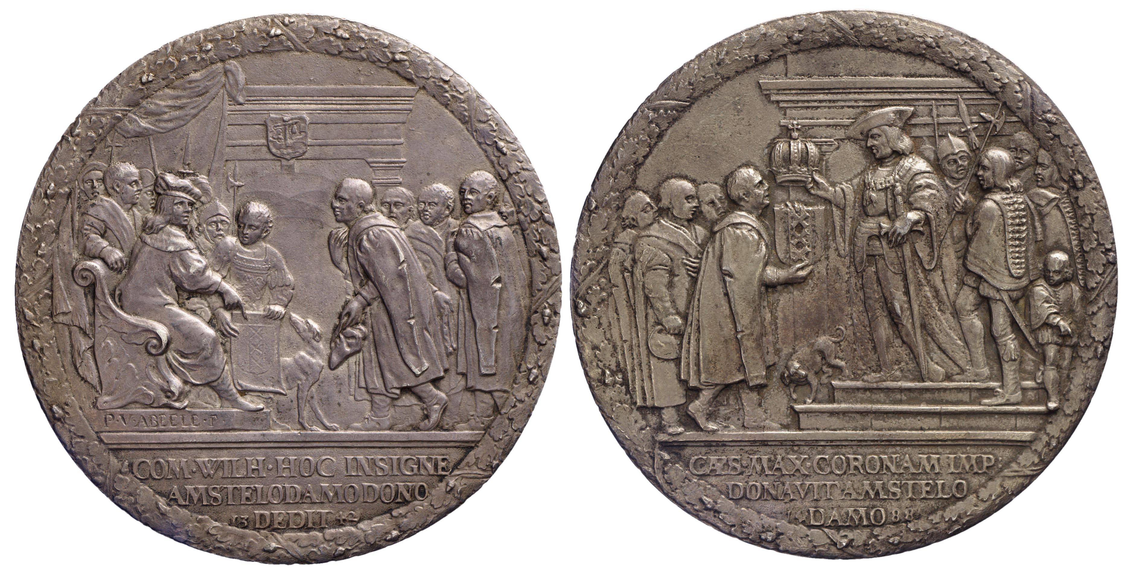 keerzijde: eikenbladkrans, keizer Maximiliaan kroont in het bijzijn van een aantal edelen en Amsterdamse notabelen het Amsterdamse wapen met de keizerskroon. Een hond kijkt toe. In de afsnede een opschrift.