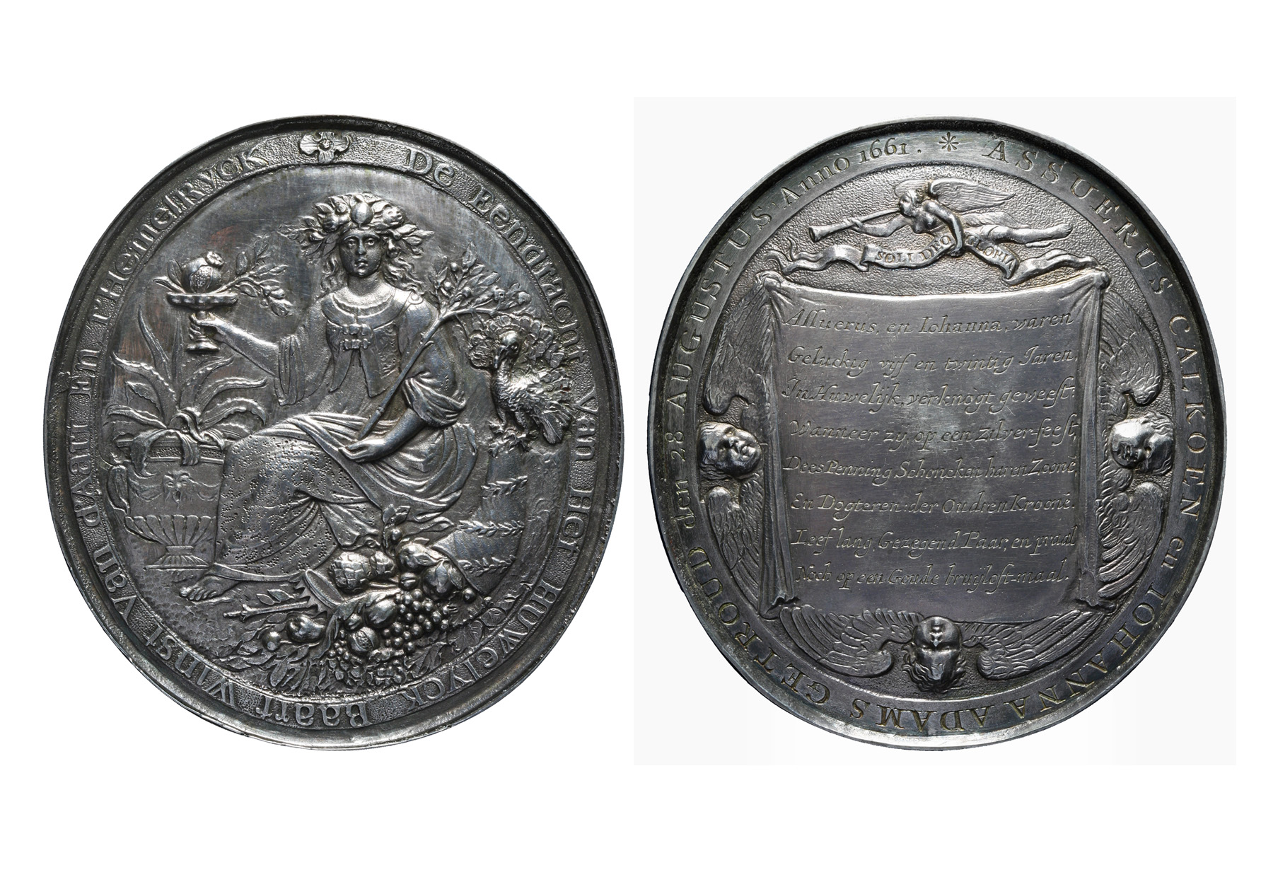omschrift keerzijde: Assuerus Calkoen en Joanna Adams getroud den 28 augustus anno 1661