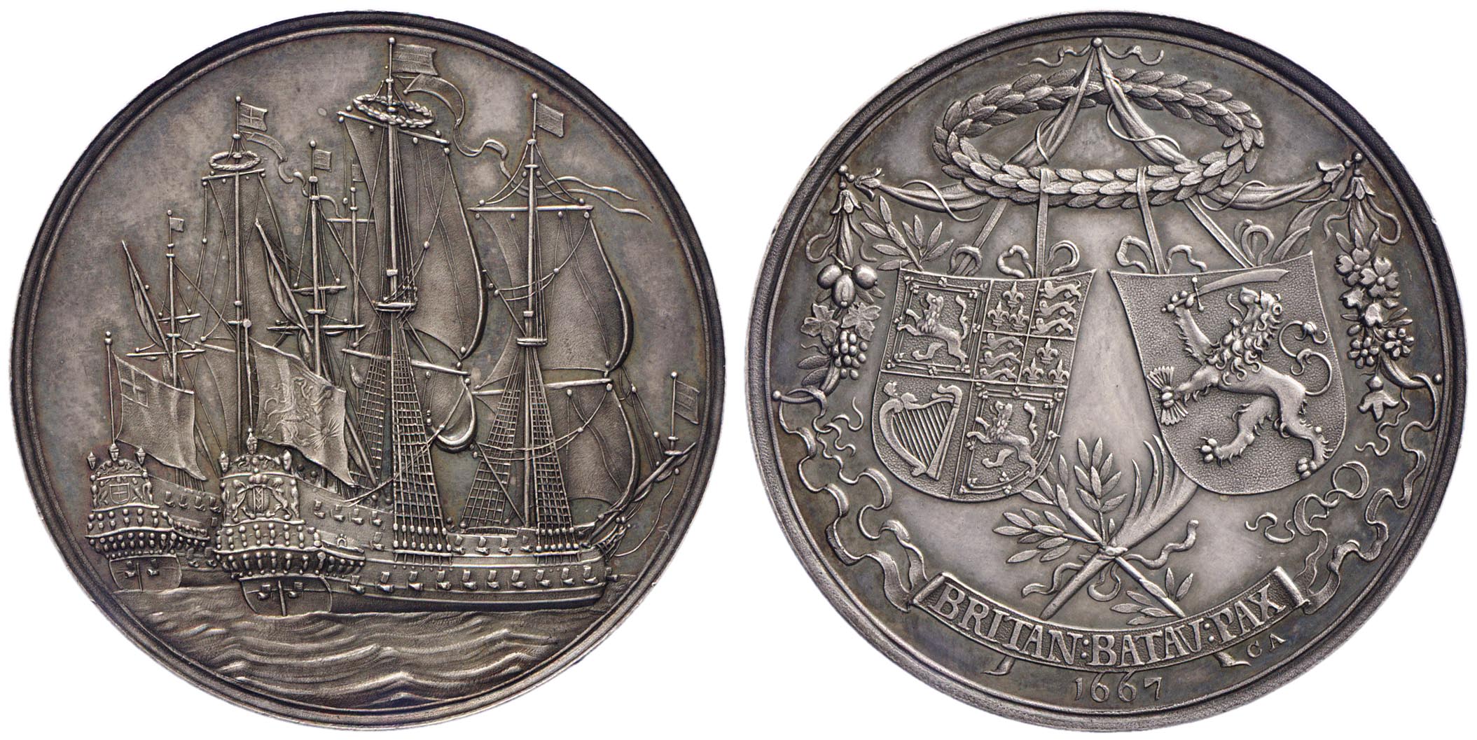 keerzijde: de wapenschilden van Engeland en de Verenigde Nederlanden, samengehouden door een krans. Daaromheen een draperie van bloemen en fruit.