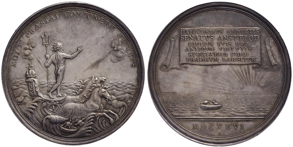 opschrift keerzijde: HALCYONIBVS REDVCTIS SENATVS AMSTELOD CIVIBVS SVIS HOC ANTIQVAE VIRTVTIS SPECTATAEQ FIDEI PRAEMIVM LARGITVR.