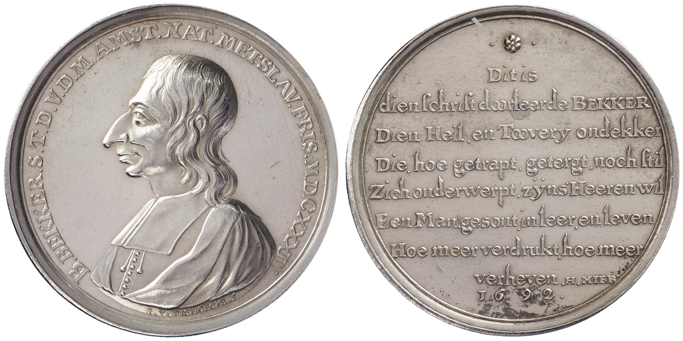 voorzijde: borstbeeld van ds. Balthasar Bekker naar links gekeerd met mantel en bef, met een omschrift.