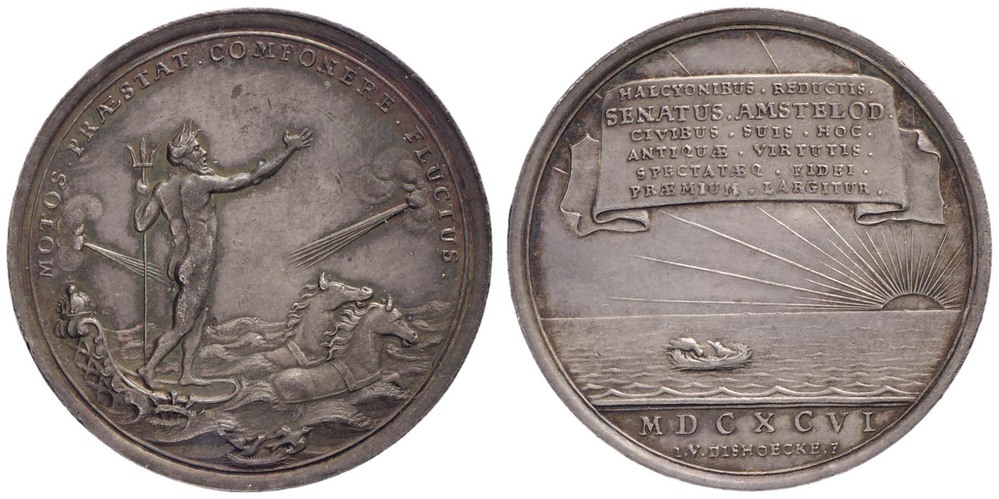 opschrift keerzijde: HALCYONIBUS . REDUCTIS . / SENATUS . AMSTELOD . / CIVIBUS . SUIS . HOC . / ANTIQUAE . VIRTUTIS . / SPECTATAEQ . FIDEI . LARGITUR .