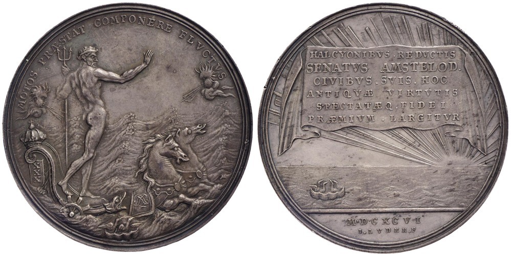 opschrift keerzijde: HALCYONIBUS . REDUCTIS . / SENATUS . AMSTELOD . / CIVIBUS . SUIS . HOC . / ANTIQUAE . VIRTUTIS . / SPECTATAEQ . FIDEI . LARGITUR .