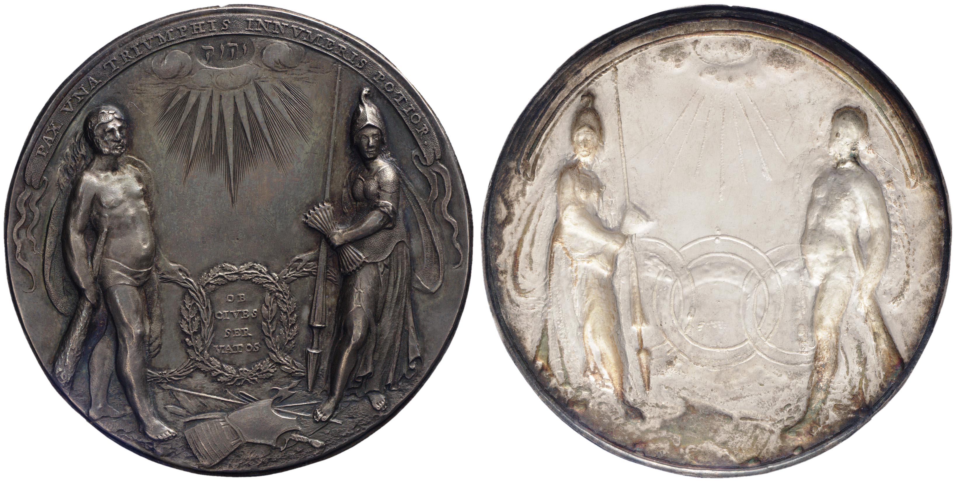 Voorzijde: tussen staande figuren van Hercules en Athena drie kransen dooreengevlochten: links en rechts een laurierkrans, in het midden een krans van eikenblad met daarin tekst. Aan hun voeten een harnas en neergeworpen wapens. Links staat de bebaarde Hercules, met de huid van de Nemeïsche leeuw over zijn lendenen en hoofd gedrapeerd. Hij houdt een knots in zijn rechterhand terwijl zijn linkerhand op een laurierkrans rust. Rechts staat Athena die een klassiek gewaad en een gepluimde helm draagt. Met haar linkerhand houdt zij een pijlenbundel vast, haar rechterhand rust op een laurierkrans. Een speer met de punt naar beneden leunt tegen haar rechterzijde. Boven de kransen wolken, midden boven in een stralenkrans JAHWEH in Hebreeuwse tekens. Langs de bovenrand een banderol met opschrift.