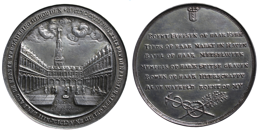 opschrift keerzijde: ROEMT EPHESEN OP HAAR KERK / TIRUS OP HAAR MARKT EN HAVEN / BABEL OP HAAR METSELWERK / MEMPHIS OP HAAR SPITSE GRAVEN / ROMEN OP HAAR HEERSCHAPPY / AL DE WAERELD ROEMT OP MY