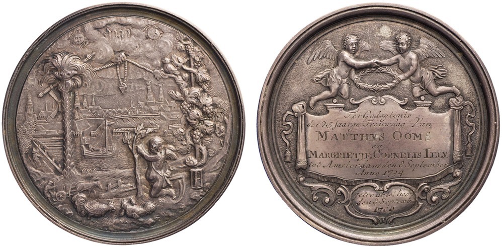 De voorzijde staat in het teken van trouw en vruchtbaarheid: op de voorgrond aan de oever van een rivier Amor die een boompje plant. Om hem heen scharrelen een haan en een hen met kuikens. Op de grond liggen een zeis en een zandloper. Links een palmboom, symbool van eeuwig leven, met kroon en scepter; rechts een wijnstok met druiventrossen met op een tak een vogel. Boven in de wolken in Hebreeuws schrift "Jahweh", links en rechts daarvan twee zonnen. Een hand uit de wolken houdt een ketting vast, die de palmboom en wijnstok met elkaar verbindt en die met een slot is gesloten. In de achtergrond een ommuurde stad met gracht en daarvoor op de rivier een zeilboot. Links een figuur met een ploeg en twee paarden en een man met een schop in een veld.