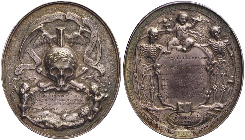 Keerzijde: in het midden een cartouche omlijst door beenderen, vastgehouden door twee skeletten. Het skelet links houdt een zeis vast; het skelet rechts een toorts die omlaag hangt. Bovenop het cartouche zit een bellen blazende putto in zijn rechterhand een schaal van waaruit zeepbellen opstijgen en in zijn linkerhand de blaaspijp. Hij heeft een sjerp om en achter hem bolt een cape op. Midden onder op de rand van het cartouche een opengeslagen bijbel.Daaronder een kleinere cartouche met links een engelenvleugel en rechts een vleermuisvleugel.