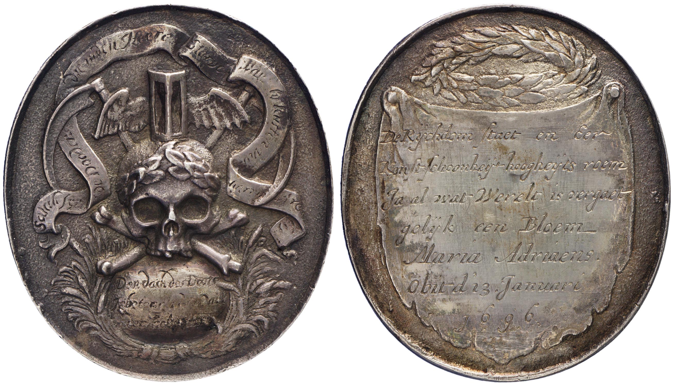 Voorzijde: een schedel rustend op twee gekruiste beenderen en omkranst met een lauwerkrans. Daarop een gevleugelde zandloper. Achter de schedel twee gekruiste zeisen met daar doorheen gevlochten een banderol met tekst. Onder de schedel een cartouche met tekst. Daaronder samengebonden korenhalmen.