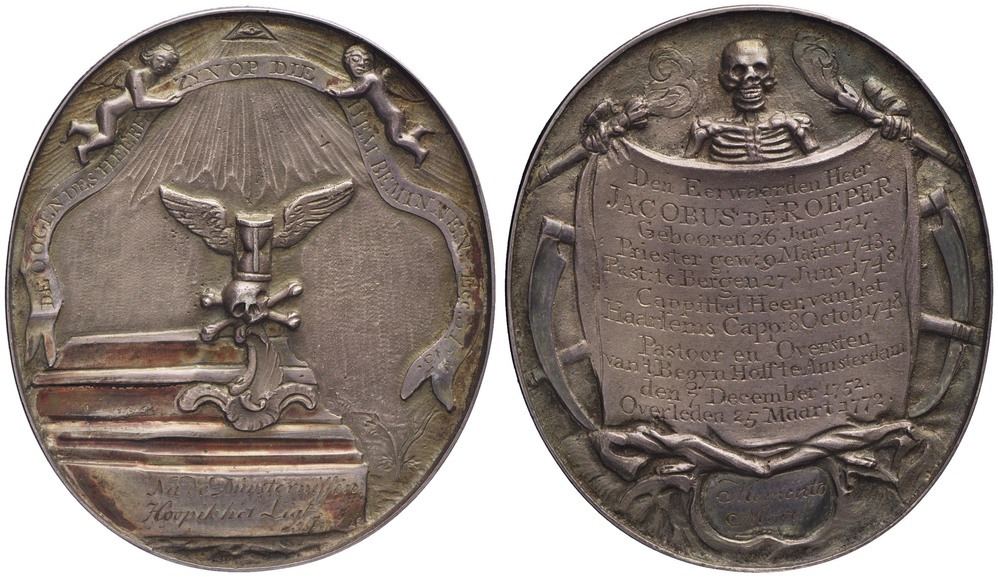 Keerzijde: midden boven: het alziend oog van God in een driehoek van waaruit hemelse stralen neerdalen op een doodshoofd met daarachter twee gekruiste beenderen. Schuin op het doodshoofd een gevleugelde zandloper. Het doodshoofd bevindt zich op een sierlijke krul rechts boven een doodskist op een verhoging. Rechts daarvan een plant. Op de verhoging tekst. Boven, links en rechts van het Alziend Oog, zweven twee putti die een banderol met tekst vasthouden.
