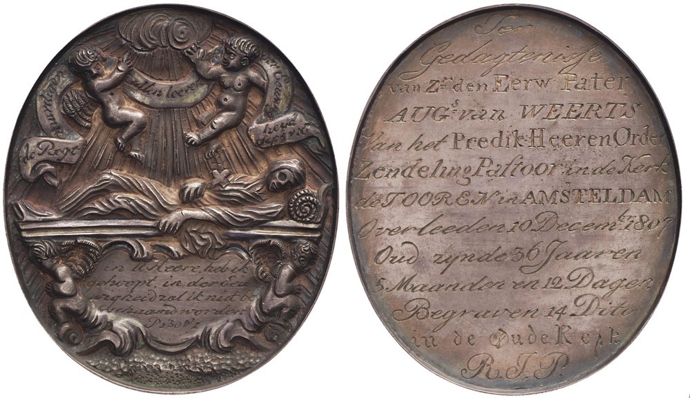 opschrift keerzijde: Ter / Gedagtenisse / van Zr den Eerw Pater / AUGs van WEERTS / Van het Predik Heeren Orde / Zendeling Pastoor in de Kerk / de TOOREN in AMSTELDAM / Overleeden 10 Decembr 1807 / Oud zijnde 36 Jaaren / 5 Maanden en 12 Dagen / Begraven 14 Dito / in de Oude Kerk / R.I.P.