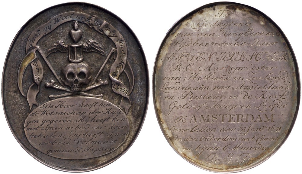 opschrift keerzijde: Ter / Gedachtenis / van den Hoog Eerw en / Wijd beroemde Heer / Hs Fs TEN HULSCHER / R.C: Aartspriester / van Holland en Zeeland / Landdeken van Amstelland / en Pastoor in de Kerk / Geloof Hoop en Liefde / Te AMSTERDAM / Overleden den 31 Jan.ry 1811 / in den Ouderdom van 64 Jaren / en bijna 6 Maanden / R.I.P.