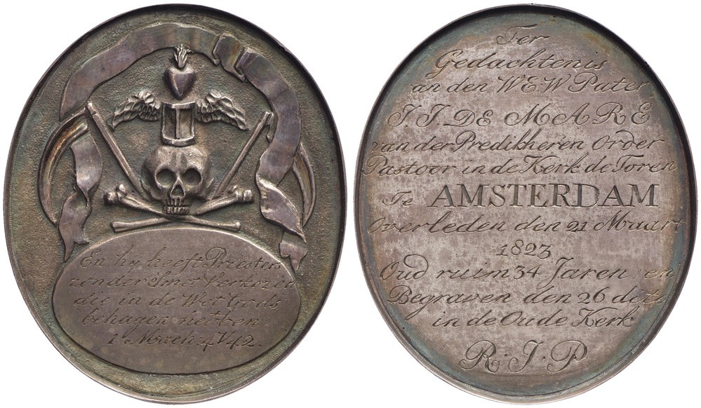 opschrift keerzijde: Ter / Gedachtenis / an den W.E.W Pater / J.J. DE MARE / van der Predikheren Order / Pastoor in de Kerk de Toren / Te AMSTERDAM / Overleden den 21 Maart / 1823 / Oud ruim 34 Jaren en / Begraven den 26 dito / in de Oude Kerk / R.I.P