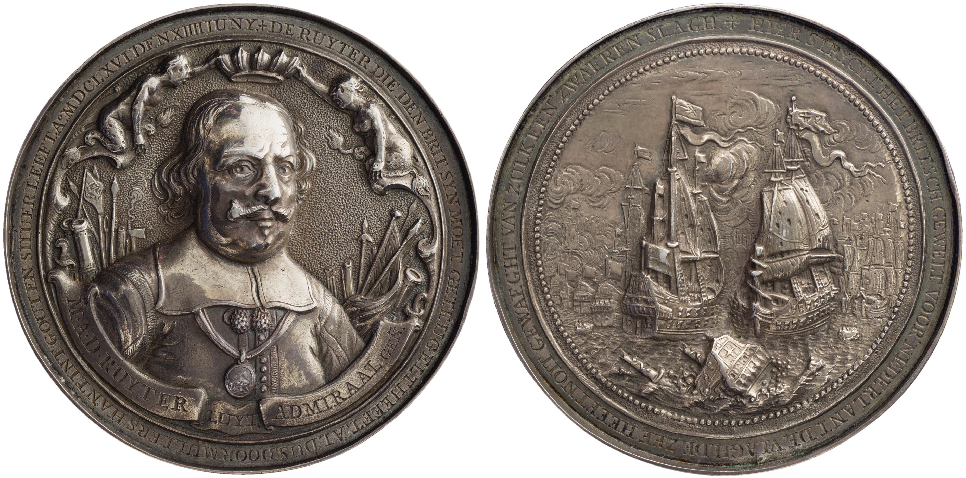 omschrift voorzijde: DE RUYTER DIE DEN BRIT SYN MOET GETEUGELT HEEFT, ALDUS, DOOR MULLERS HANT, IN T GOUT EN SILVER LEEFT, Aº MDCLXVI DEN XIIII IUNY.