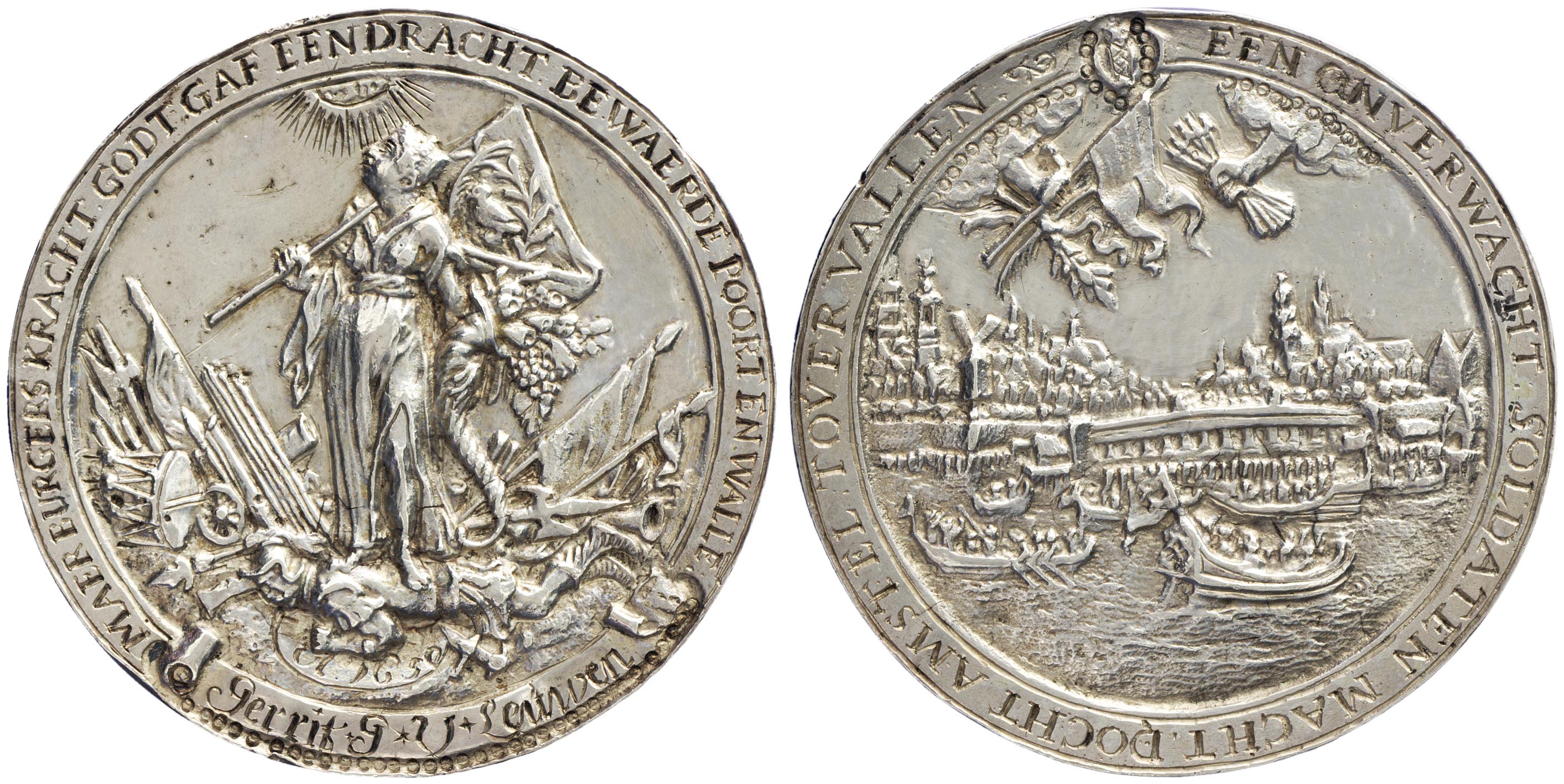 omschrift keerzijde: MAER BURGERS KRACHT GODT GAF EENDRACHT BEWAERDE POORT EN WALLE.