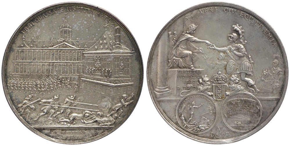 opschrift keerzijde rechtsonder: HALCYONIB . REDUCTIS / SENATUS AMSTEL / CIVIBUS SUIS HOC / ANTIQ . VITRTUTIS / SPECTATAEQ . FIDEI / PRAEMIUM LARGITUR .
