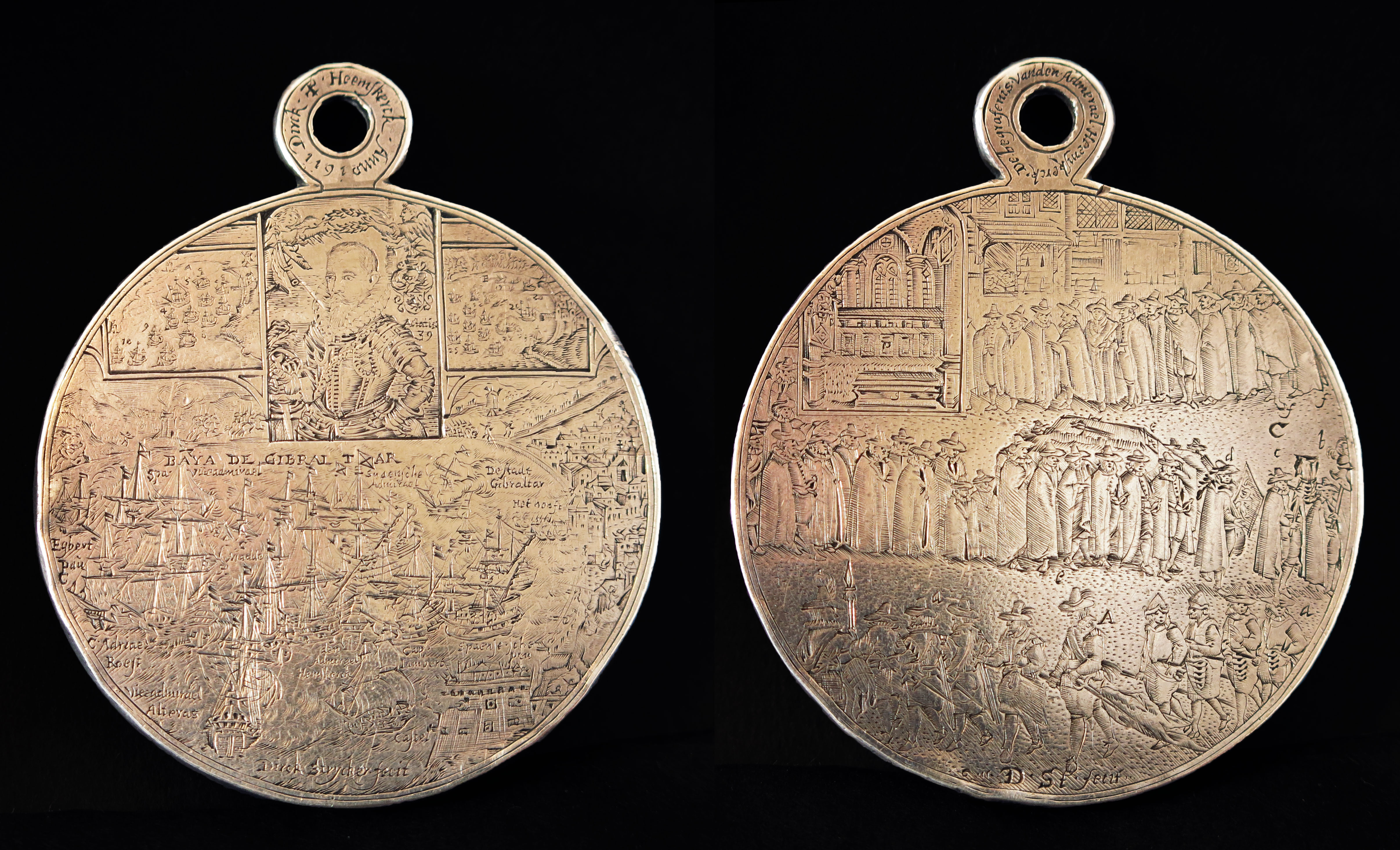 Admiraal Jacob van Heemskerck stierf letterlijk in het harnas tijdens de Slag bij Gibraltar. Zijn heldhaftige dood was aanleiding voor de eerste staatsbegrafenis in de Republiek die in minutieus detail op een unieke penning werd weergegeven. De penning in het Amsterdam Museum is een voor zover bekend enig exemplaar van een penning die zowel de Slag bij Gibraltar als de staatsbegrafenis memoreert.