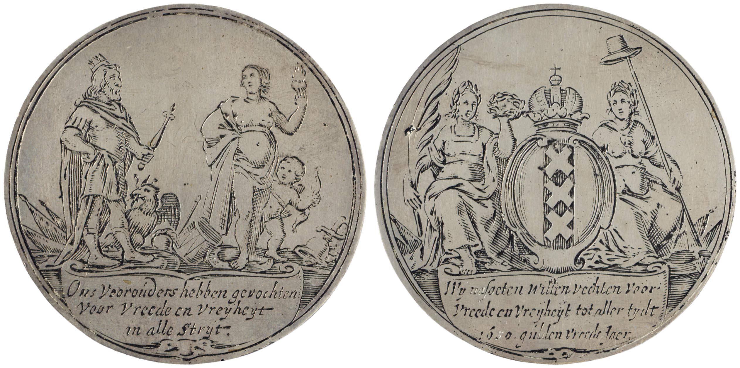 opschrift keerzijde: Wy nasaeten willen vechten voor / Vreede en Vreijheijt tot aller tydt / 1650 gulden Vreede Jaer
