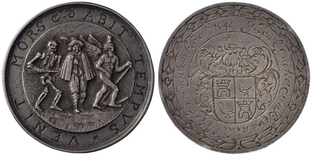 Voorzijde: een mansfiguur met halflang haar, gekleed in een wambuis, broek en laarzen, met een korte cape om de schouders en een hoed met veer op het hoofd. Hij zet zijn rechtervoet voor zijn linker. Hij staat tuseen de Dood in de vorm van een skelet (links) met in de rechterhand een hamer met een lange steel waarmee hij naar de man wijst en de gevleugelde en gehelmde Tijd die in zijn linkerhand een zeis vasthoudt. Dood en Tijd bewegen zich naar rechts, de man beweegt zich naar voren. Omschrift.