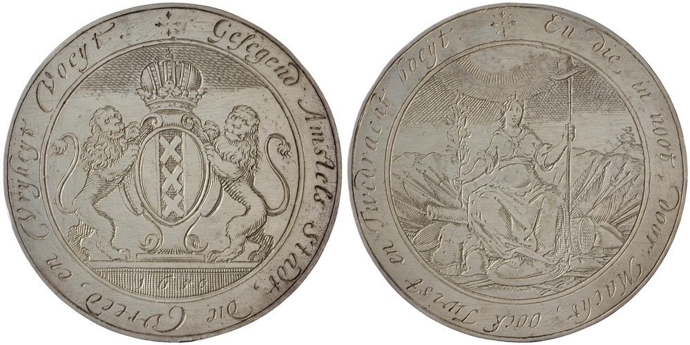 omschrift voorzijde: Gesegend Amstels Stadt, die Vreed en Vrijhijt Voeijt