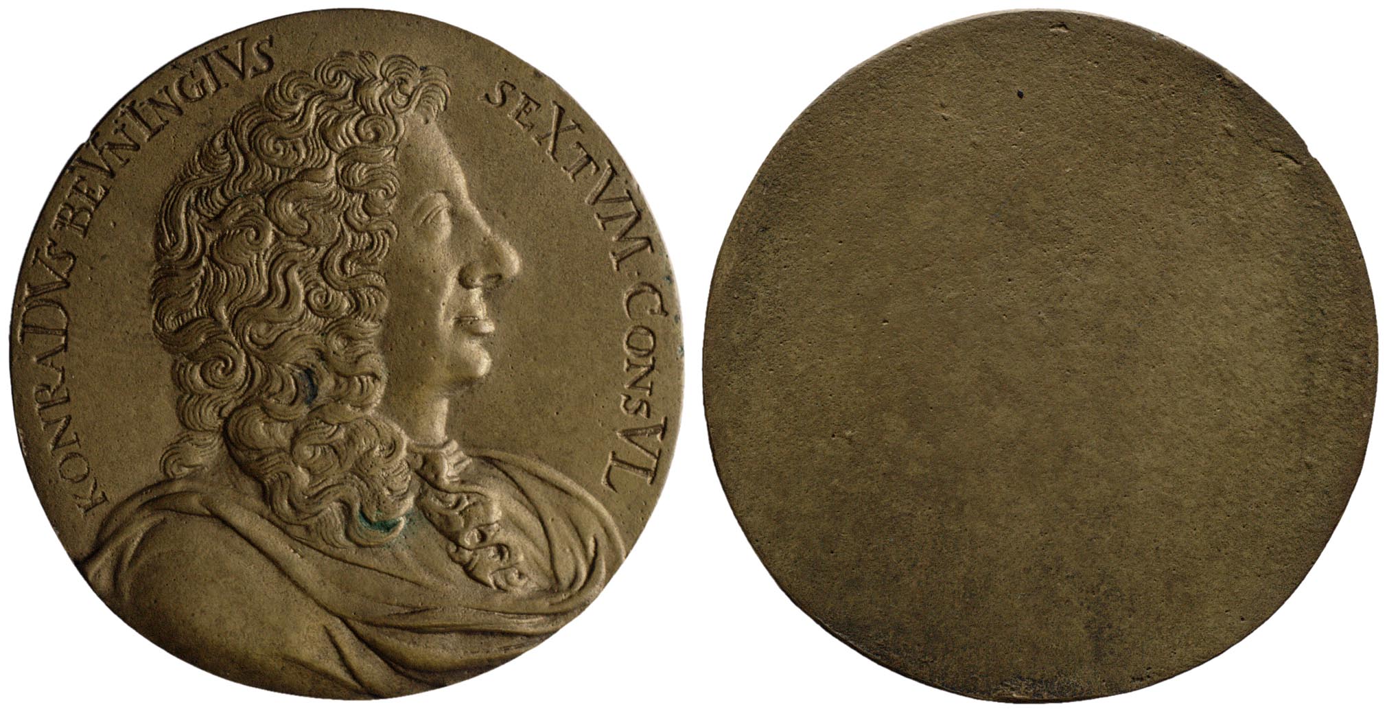 Coenraad van Beuningen (1622-1693) zesmaal burgemeester van Amsterdam, diplomaat, 1687 koper, metaal hoogte: 4.2 cm; breedte: 4.2 cm; diepte: 0.2 cm; gewicht: 20.30 gr; omschrift voorzijde: konraDVs beVnIngIVs seXtVM ConsVL
