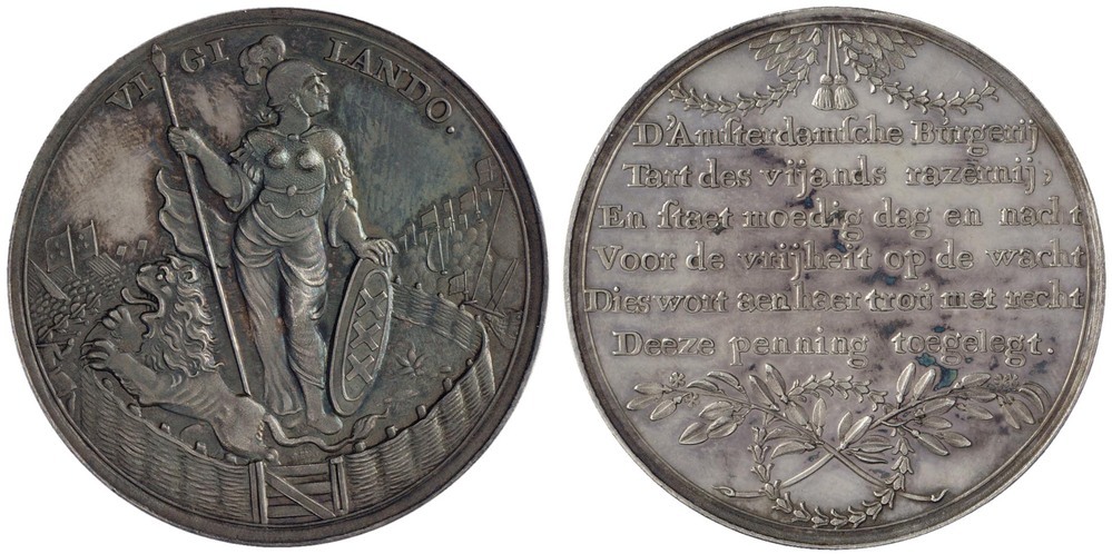 opschrift keerzijde: D'Amsterdamsche Burgerij / Tart des vijands razernij, / En staet moedig dag en nacht / Voor de vrijheit op de wacht / Dies wort aen haer troú met recht / Deeze penning toegelegt.