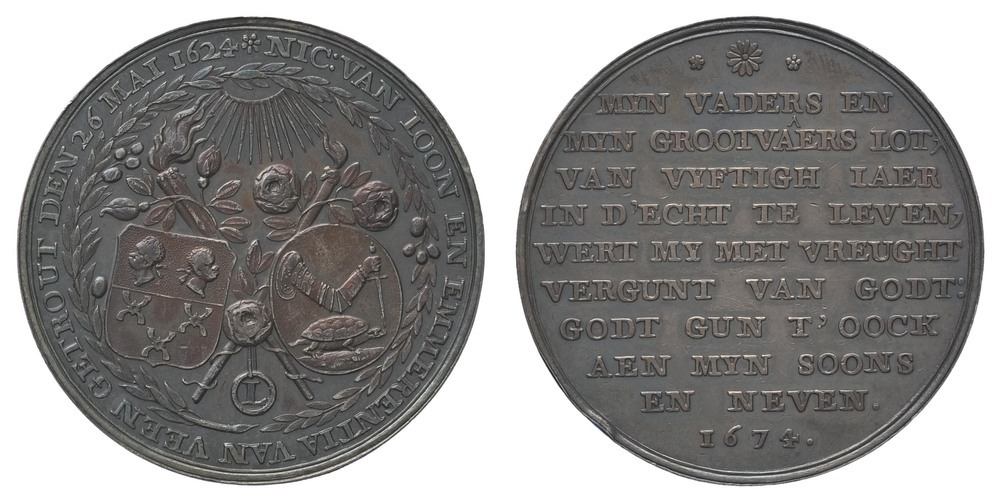 opschrift keerzijde: myn vaders en / myn grootvaers lot, / van vyftigh iaer / in d'echt te leven / wert my met vreught / vergunt van Godt:/ God gun t'oock / aen myn soons / en neven / 1674.