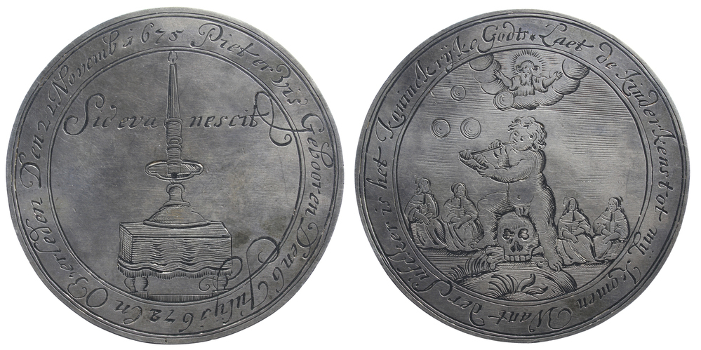 Voorzijde: een bellen blazende putto (homo bulla) gezeten op een doodshoofd met de zeep in een mosselschelp als vanitas symbool; de kwetsbare kortstondigheid van het leven wordt symbolisch vergeleken met de fragiliteit van een luchtbel. Achter de putto vier vrouwen in identieke kleding met de armen over elkaar. Onder het doodshoofd gekruiste beenderen. Het doodshoofd rust op een met gras begroeid heuveltje. Boven in de wolken God de Vader met om zijn hoofd een stralenkrans, die zijn armen beschermend uitstrekt. Omschrift.