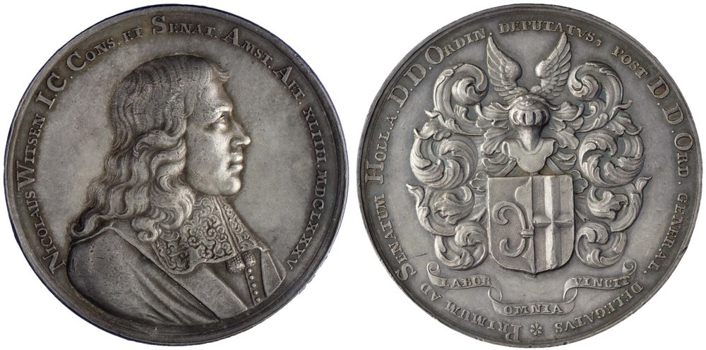 omschrift voorzijde: NICOLAUS WITSEN I . C . CONS . ET . SENAT . AMST . AET . XLIIII . MDCLXXXV