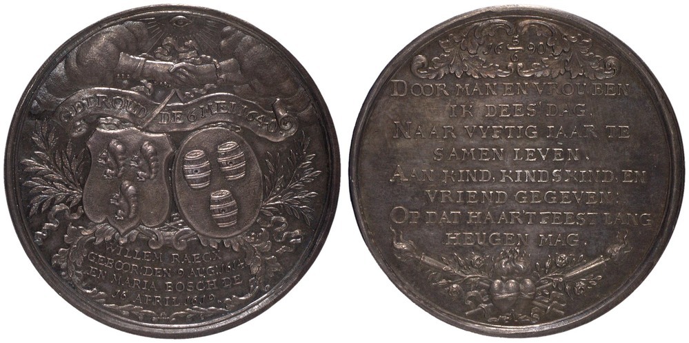 keerzijde: tussen een cartouche met bladmotief staat een datum. Onderaan twee brandende toortsen die tesamenkomen bij twee harten, omgeven door bloeiende takken. In het veld een 8-regelig opschrift.