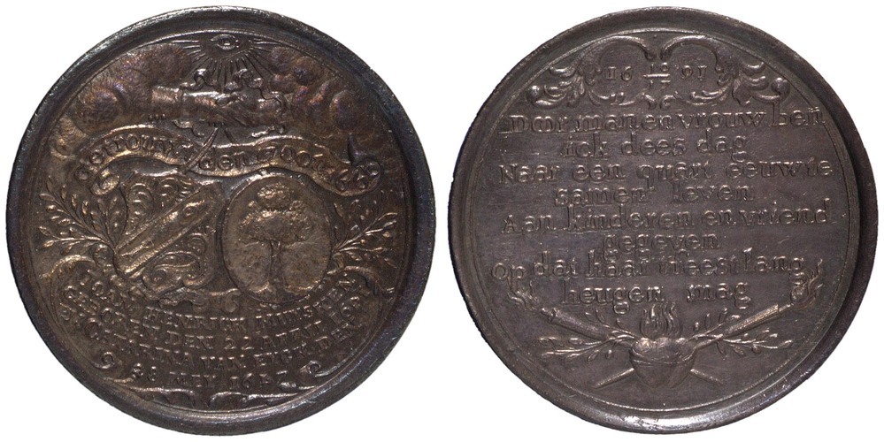 keerzijde: tussen een cartouche met bladmotief staat een datum. Onderaan twee brandende toortsen die tesamenkomen bij twee harten, omgeven door twee olijftakken. In het veld een 8-regelig opschrift.