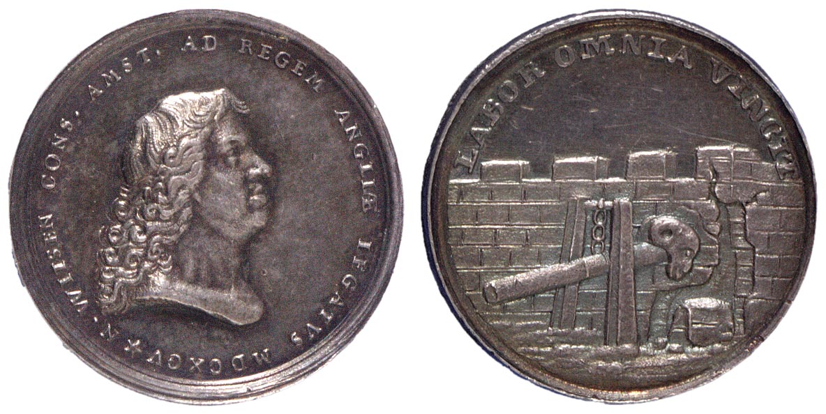Nicolaes Witsen (1641-1717), ter gelegenheid van zijn gezantschap naar de Engelse koning, 1695 zilver hoogte: 2.4 cm; breedte: 2.4 cm; diepte: 0.2 cm; gewicht: 8.19 gr; omschrift voorzijde: N . WITSEN CONS . AMST . AD REGEM ANGLIAE LEGATVS M . DCXCV *