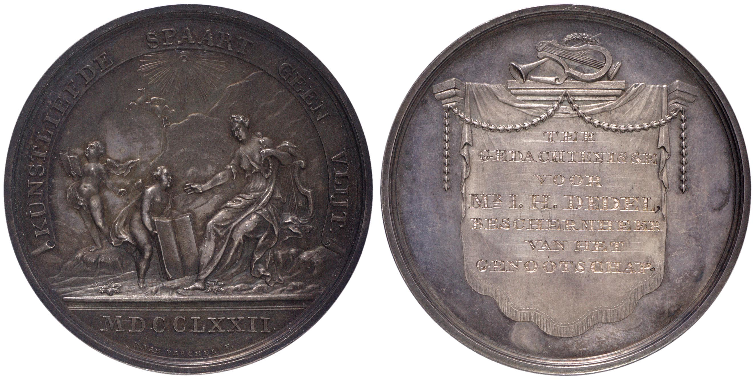 opschrift keerzijde: TER / GEDACHTENISSE / VOOR / MR I.H. DEDEL / BESCHERMHEER / VAN HET / GENOOTSCHAP