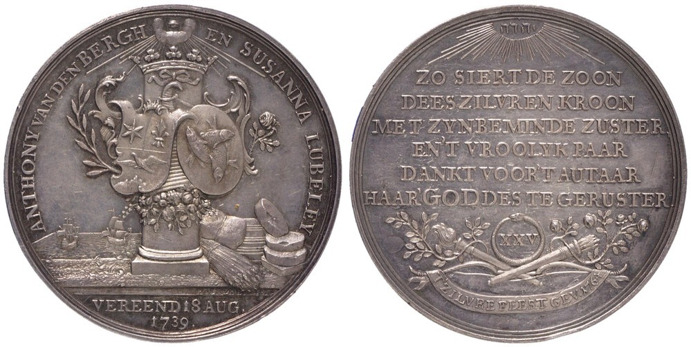 opschrift keerzijde: Zo siert de zoon / dees zilvren kroon / met zyn beminde zuster / en 't vroolyk paar / dankt voor 't autaar / haar' GOD des te geruster