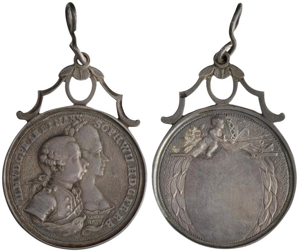 voorzijde: in een omschrift de borstbeelden van Willem V en zijn gemalin Wilhelmina van Pruisen. Bovenaan een driepoots hanger met oog.