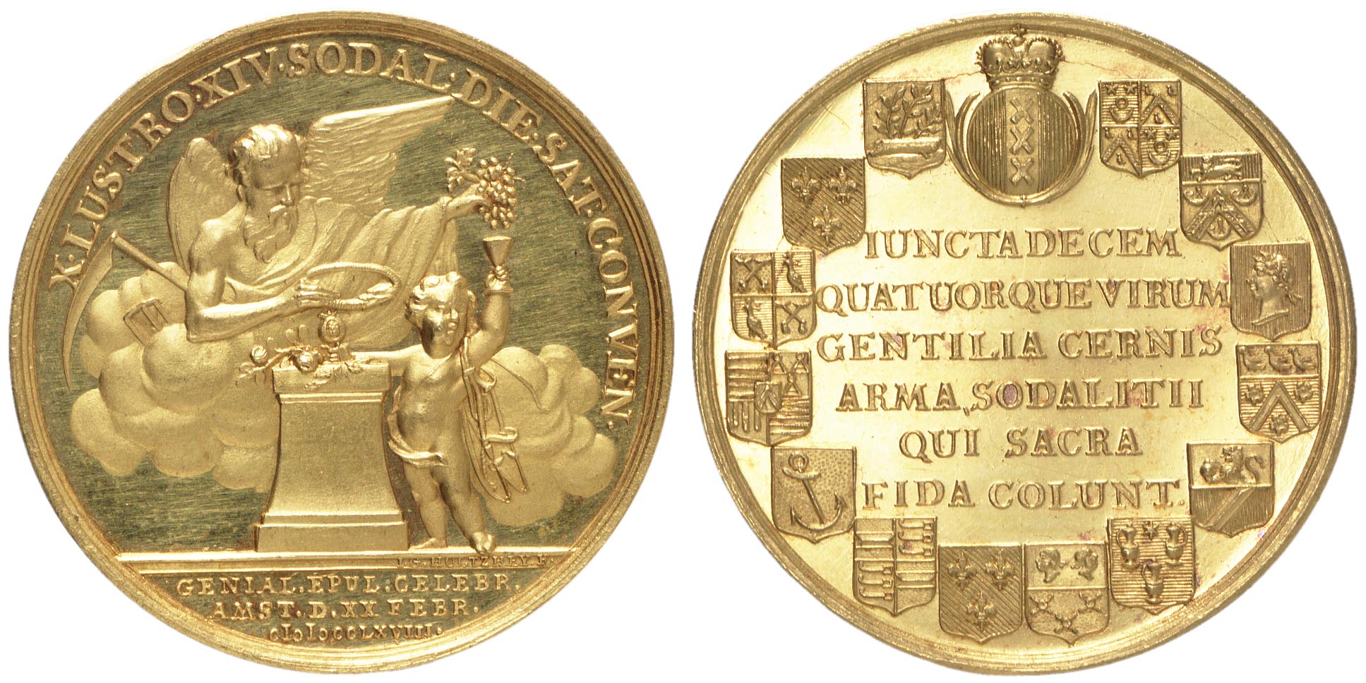 opschrift voorzijde in de afsnede: GENIAL.EPUL.CELEBR. / AMST.D.XX FEBR. / CICICCCLXVIII.