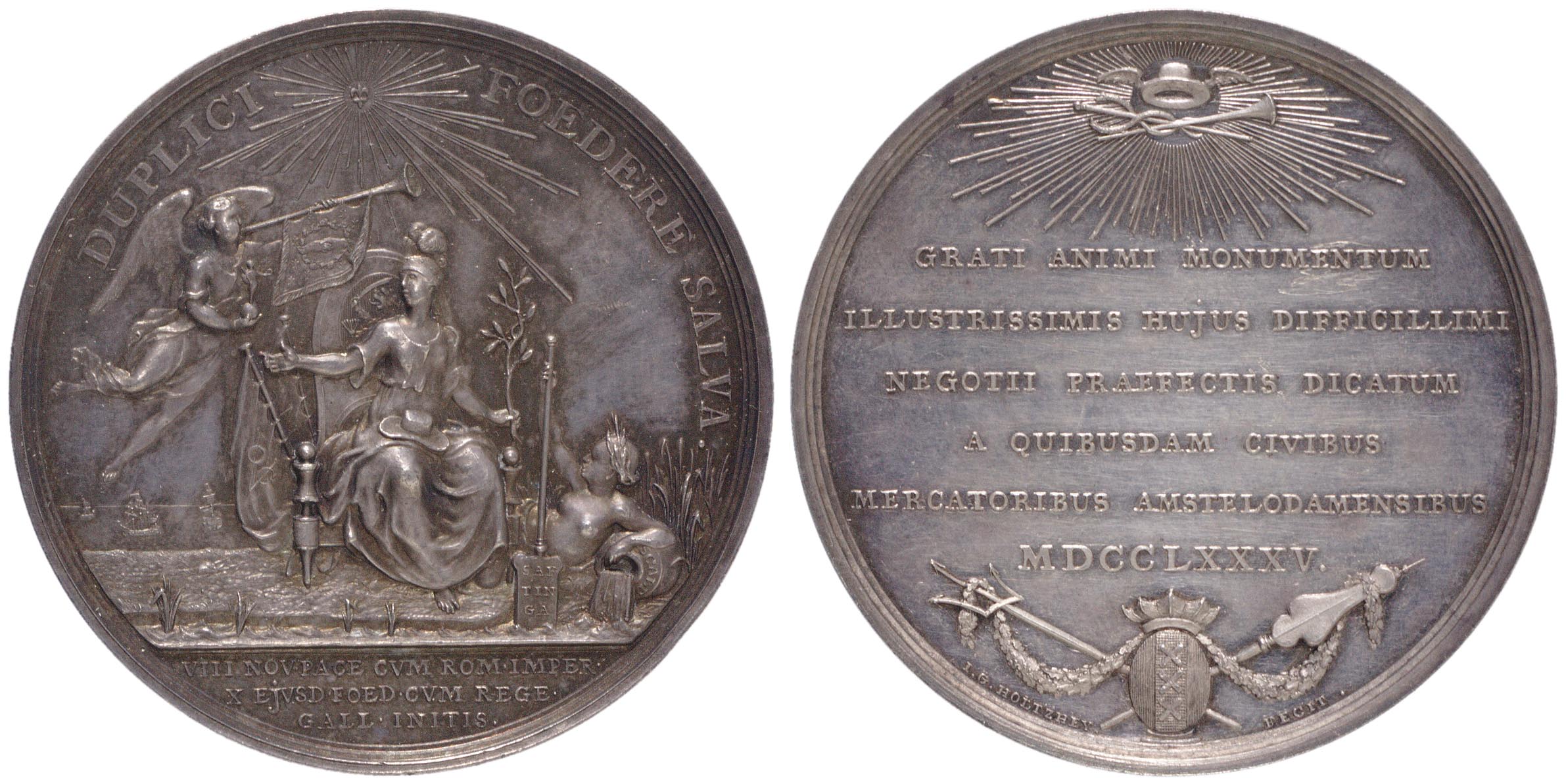 opschrift keerzijde: GRATI ANIMI MONUMENTUM / ILLUSTRISSIMIS HUJUS DIFFICILLIM / NEGOTII PRAEFECTIS DICATUM / A QUI DUSDAM CIVIBUS / MERCATORIBUS AMSTELODAMENSIBUS / MDCCLXXXV.