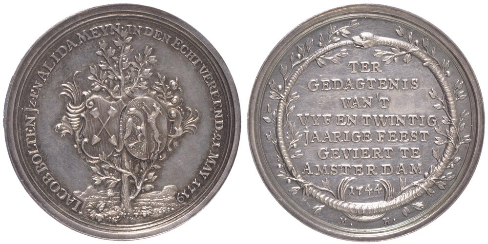 opschrift keerzijde: Ter / gedagtenis / van 't / vyf en twintig / jaarige feest / geviert te / Amsterdam / 1744