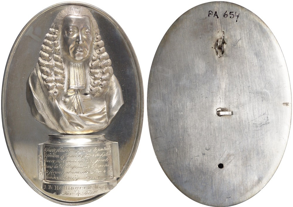 De geportretteerde stelt Hendrik Hooft Daniëlszn. (1716-1794) voor, de democratisch-patriottisch gezinde burgemeester van Amsterdam in de jaren tachtig van de achttiende eeuw. Hij genoot onder de bevolking grote populariteit en gold als de verpersoonlijking van de patriotse idealen. 'Vader Hooft' werd hij genoemd. Zijn beeltenis sierde talloze (draag)insignes als deze. Welke prent Hoffinger de Wespin als voorbeeld heeft gebruikt is niet met zekerheid te zeggen. Mogelijk betreft het een gravure door A. Bochers (Ritsema van Eck 1995, p. 446 afb.).