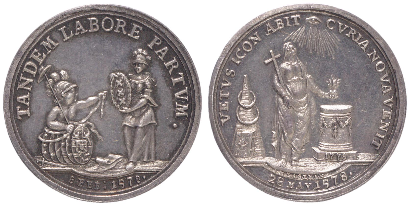 voorzijde: in een omschrift zit het genie Vrijheid bij zes wapenschilden, steden van de prinsgezinden, verbonden met een lint, met in zijn rechterhand een speer met vrijheidshoed en wijst met zijn linkerhand naar de stedenmaagd van Amsterdam die het wapenschild van Amsterdam ophoudt en schoorvoetend aanrijkt om het bij de overige schilden te voegen. Aan haar voeten liggen de 24 artikelen van een verdrag met de overgave der stad Amsterdam op 8 februati 1578. In de afsnede een datum.