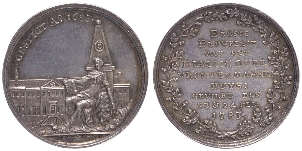opschrift keerzijde: EERSTE / EEUWFEEST / VAN HET / DIACON: OUDE / VROUWE & MANNEN / HUYS: / GEVIERT DEN / 23 & 24 FEB / 1783