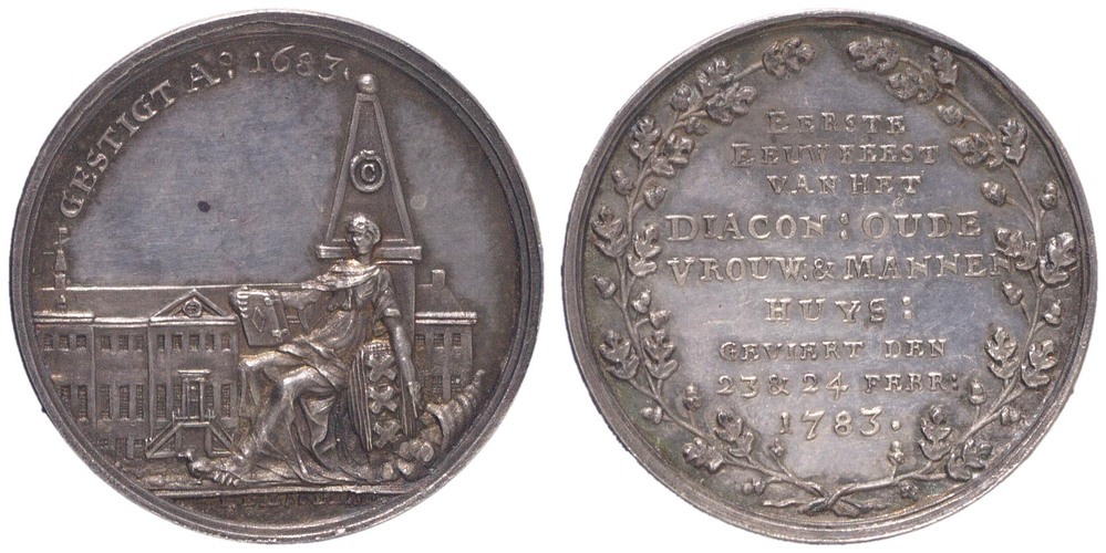 opschrift keerzijde: EERSTE / EEUWFEEST / VAN HET / DIACON: OUDE / VROUWE & MANNEN / HUYS: / GEVIERT DEN / 23 & 24 FEB / 1783