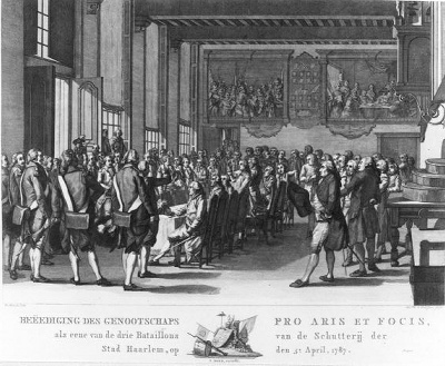 - Beëediging des Genootschaps Pro Aris et Focis, als eene van de drie Bataillons van de Schutterij der Stad Haarlem, op den 5e April, 1787. (naar W. Hendriks), 1777 - 1797