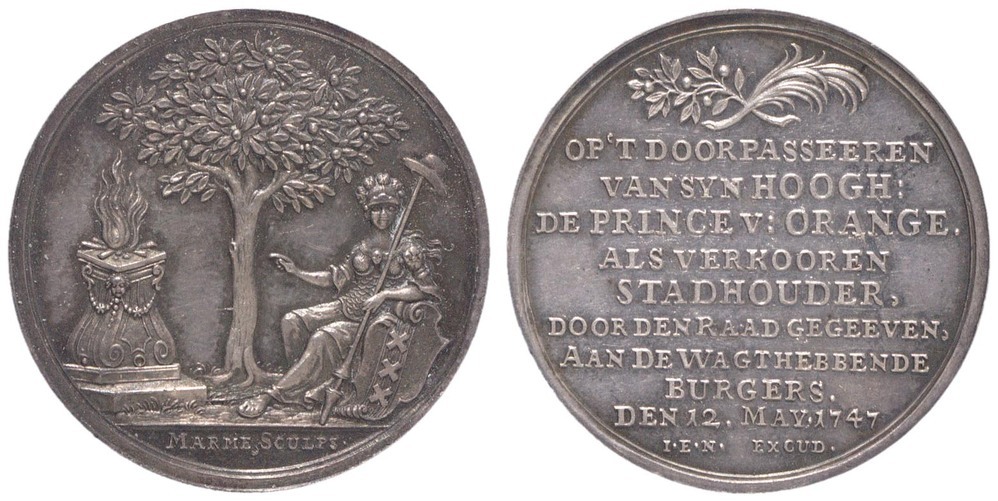 opschrift keerzijde: OP 'T DOORPASSEEREN / VAN SYN HOOGH: / DE PRINCE V: ORANGE / ALS VERKOOREN / STADHOUDER. / DOOR DEN RAAD GEGEVEN / AAN DE WAGTHEBBENDE / BURGERS. / DEN 12.MAY.1747 / I.E.N.EXC: