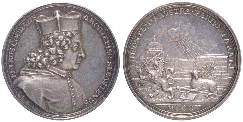 keerzijde: in een omschrift loopt de gekroonde Nederlandse leeuw naar links met zwaard en pijlenbundel; rechts het lam dat de onnozelheid verbeeldt, waar de dwingelandij van Rome (bliksemschichten uit Vaticaan), maar het lam wordt door hemels macht beschermt (bliksemschichten uit de hemel), de linkerpoot op een boek met op de kaft de tekst RESP (onder de hoede van de staat); op de achtergrond de stad Rome met de St. Pieter. In de afsnede een Romeins jaartal.