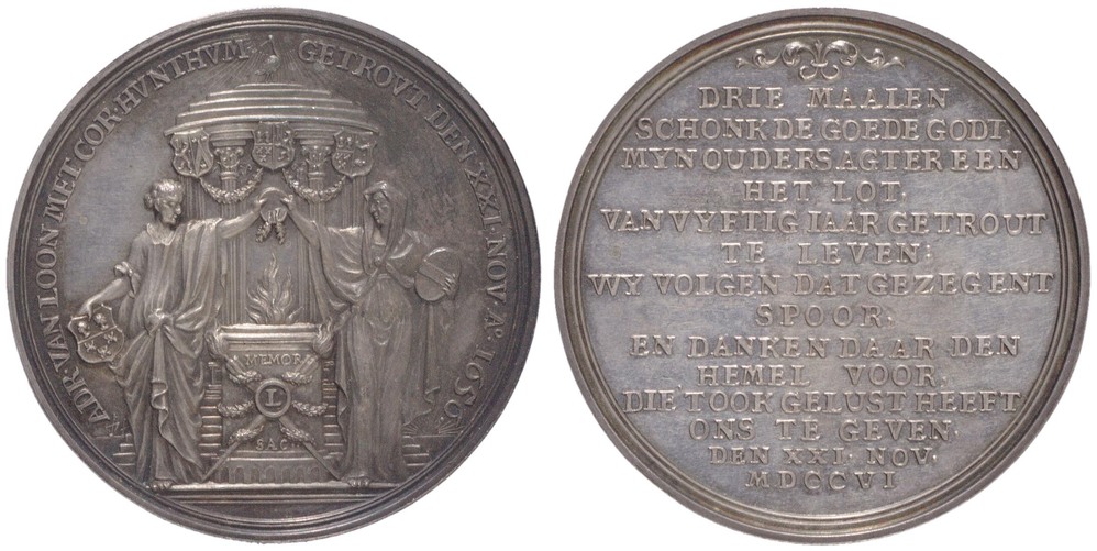opschrift keerzijde: drie maalen / schonk de goede Godt / myn ouders agter een / het lot / van vyftig iaar getrout / te leven:/ wy volgen dat gezegent / spoor / en danken daar den / hemel voor / die't ook gelust heeft / ons te geven / den XXI. nov./ MDCCVI