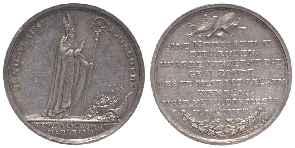 opschrift keerzijde: SANT NIKLAAS WIL U / DIT ZENDEN, / WAARDE KINDER, OP DAT / GE U ZOUDT / DES TE MEER TOT LEEREN / WENDEN, / WAAR HY ALTOOS MEEST / VAN HOUDT. / 1775